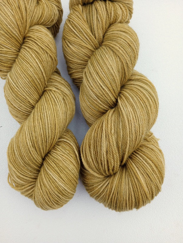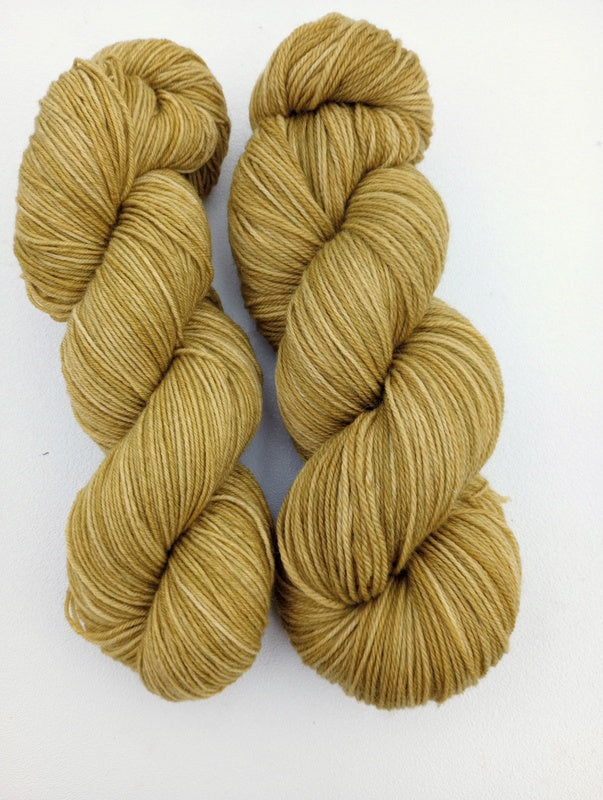 Tarnished, brassy yellow with undertones of mossy green.  The Yarny McYarnFace skein is on the right. The Merino/Nylon base is thicker than its more commonly found cousin, and very bouncy/cushy.