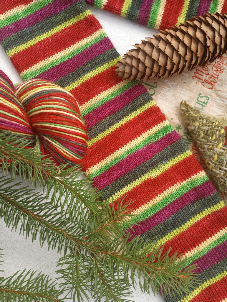 This yarn has uneven stripes of Santa Red, Holly and Ivy greens, Sugared Plum, and Mistletoe. I think it is the most fun and joyful Christmas/winter colorway we've created, and we hope it brings you lots of happiness while you work with it.