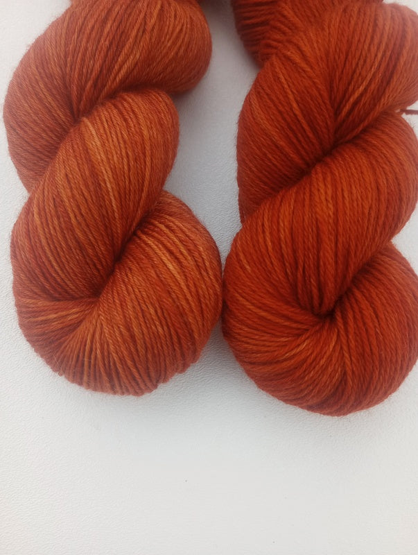 Rich, cozy orange with autumnal brown vibes. The Yarny McYarnFace skein is on the right.